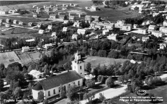 Flygfoto över Bjästa med kyrkan i förgrunden