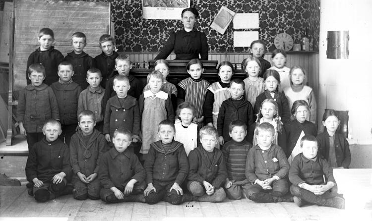 Skolklass med lärarinna och kakelugn. Troligen Bjästa.