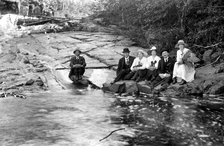 Sällskap sittande på klippig åkant (Bräckeån?), syskon Gerdin från Gärdenslund