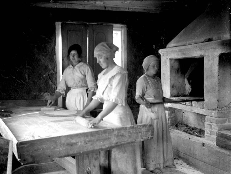 Tre kvinnor i bagarstuga i Bräcke. Maria Berglund, Linda Byström och Hilma Vestman (gift Arnell)