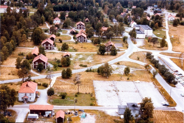 Översiktbild över Bruksvägen från 1981 tagen från taket på sodapannan. Alla hus i bildens nederkant är idag rivna och bilparkeringen igenväxt. I vita huset till vänster bodde på slutet Ivan Jansson, Uno Westerin och Lasse Öberg. Det var tänkt att samhällsföreningen efter fabriksnedläggningen skulle göra om det till Allaktivitetshus, men det låg väl för nära klorfabriken. Det röda huset närmast Bruksvägen är också rivet, där bodde bl.a. Otto Lindbloms. Det stod ett likadant hus på den grå ytan ovanför parkeringen, som nyligen hade rivits. Gamla Bruksvägen till höger bakom Centrumhuset var en riktig väg då, idag bara en stig.